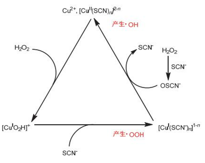 振荡反应是大学化学课程中教授的重要类型反应。在H₂O₂/SCN⁻/Cu²⁺/OH⁻振荡反应体系的催化循环过程中,会周期性地产生具有氧化性的物种,·OOH和·OH,从而周期性地氧化鲁米诺发出周期性蓝光。