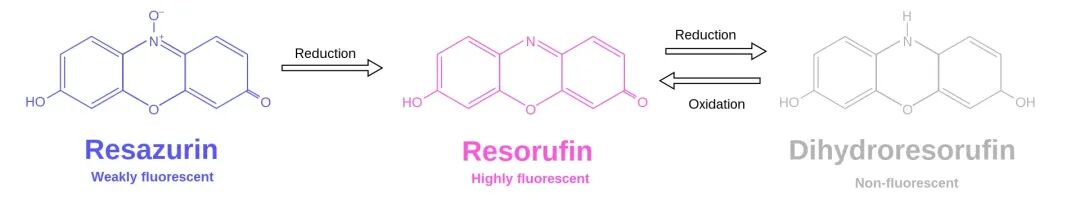 刃天青(Resazurin,又称阿拉玛蓝)是一种常用的氧化还原指示剂,它容易被活细胞或微生物代谢还原,其还原产物试卤灵(Resorufin)具有强荧光特性。基于这种特性,它常用于细胞与微生物代谢活性检测。