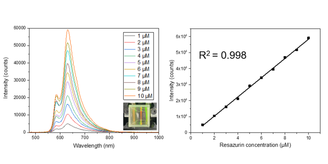 我们使用EduRaman多功能教学拉曼光谱仪,通过最低的激光强度和最短的采谱时间(10 ms)来检测微摩尔级浓度的荧光信号。通过在630 nm处的荧光峰上建立强度-浓度关系曲线,能够绘制出荧光强度与浓度之间良好的线性关系,并计算得出在该条件下的荧光物质检出限达到 6.67×10⁻⁹ M,证明该检测具备极高灵敏度。
