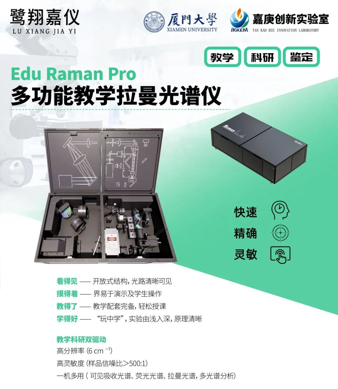 采用开放式结构设计,打破常规拉曼仪器的黑箱模式,让光路原理不再神秘,为教师和学生打造光谱教学新平台。